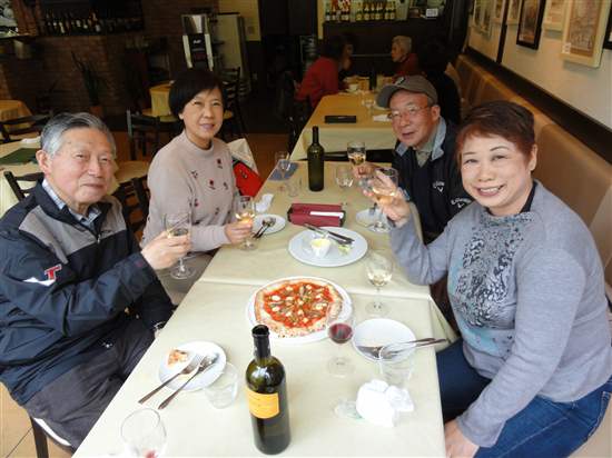 昼食はいつもの「ふもとや」でピザとワインなど |