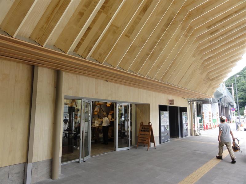 | 今年4月に新装なった駅舎の改札口 生木を使った構造物で、山をイメージして作られたそうです |
